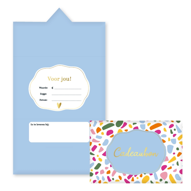 Deze drieluiks KP® cadeaubonnen met Terrazzo design zijn ideaal voor winkels die een opvallende en praktische cadeaubon willen aanbieden. Aan de binnenzijde is ruimte om waarde, datum en inleverlocatie in te vullen. Zo geef je klanten een flexibel cadeau dat altijd past.