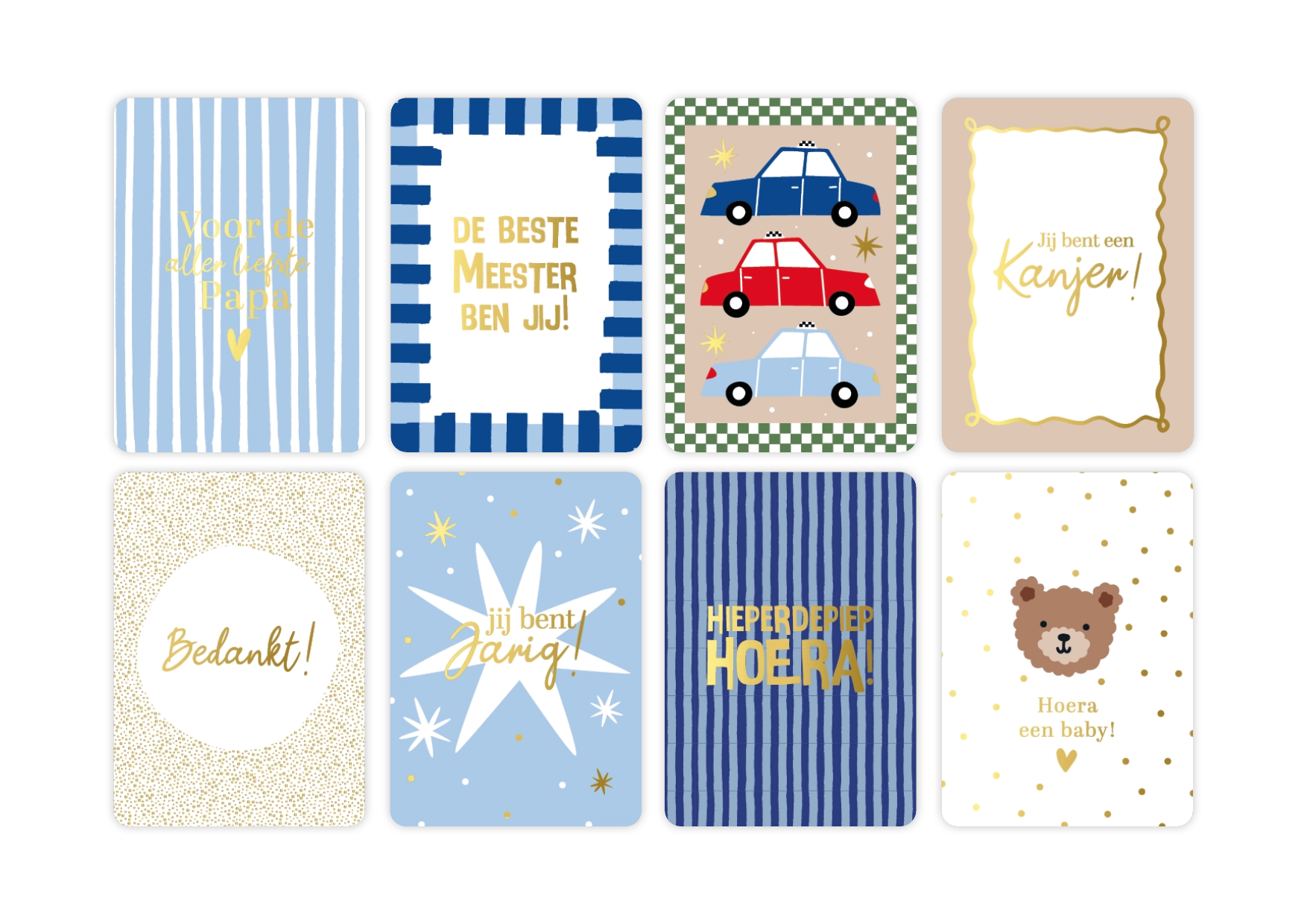In dit pakket met 24 verschillende dessins ontvangt u van elk dessin 25 kaarten. De volgende wenskaarten zitten in dit pakket: