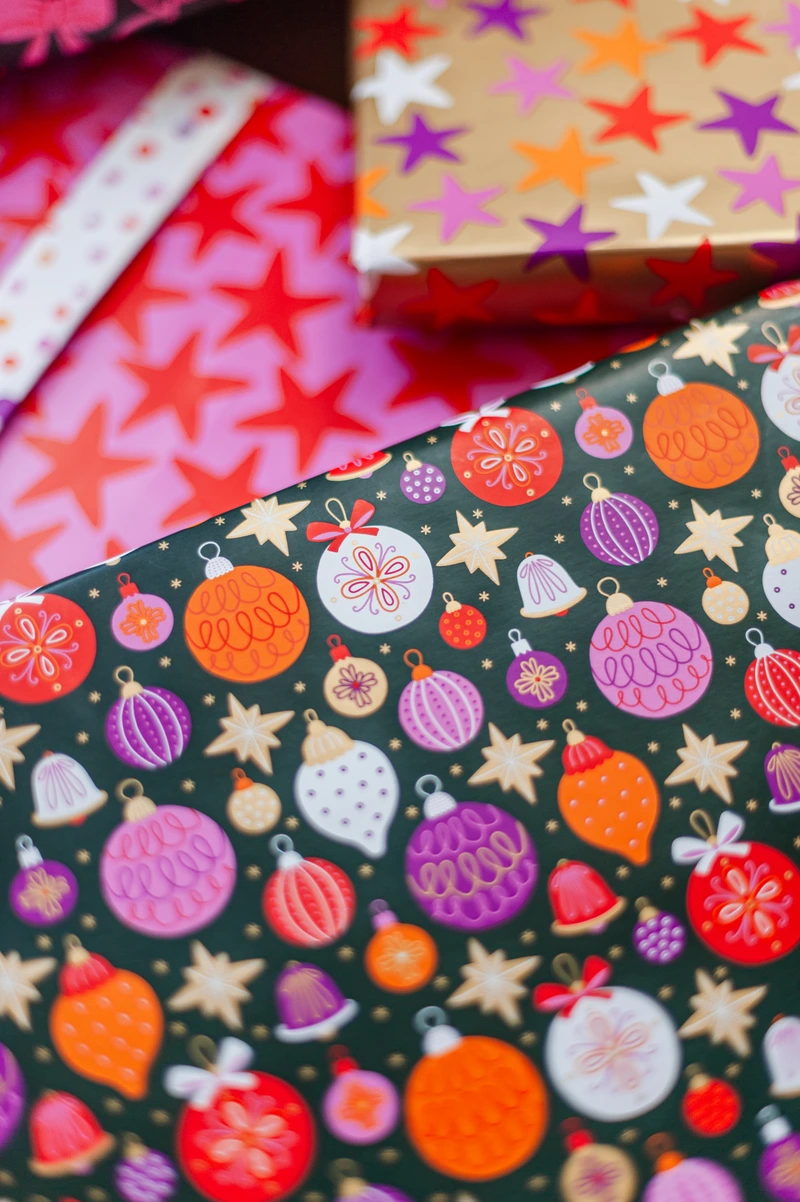 Coated cadeaupapier Christmas ornaments 100 meter. Perfect te gebruiken voor het inpakken van uw cadeautjes of geschenk.