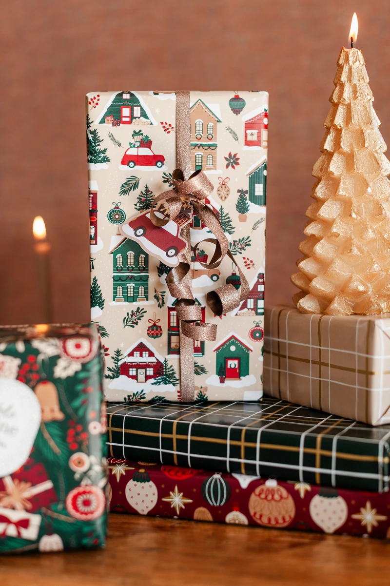 Coated cadeaupapier Kersthuisjes 100 meter. Perfect te gebruiken voor het inpakken van uw cadeautjes of geschenk.