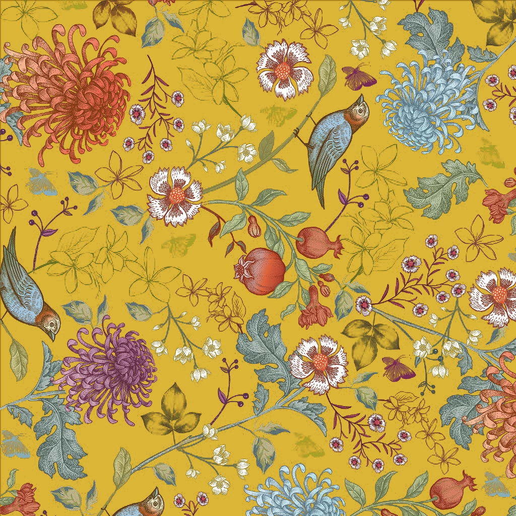 Coated cadeaupapier Birdy Blossom Ochre. Keuze uit diverse breedtes: 70 cm x 200 meter. Perfect te gebruiken voor het inpakken van uw cadeautjes of geschenk.