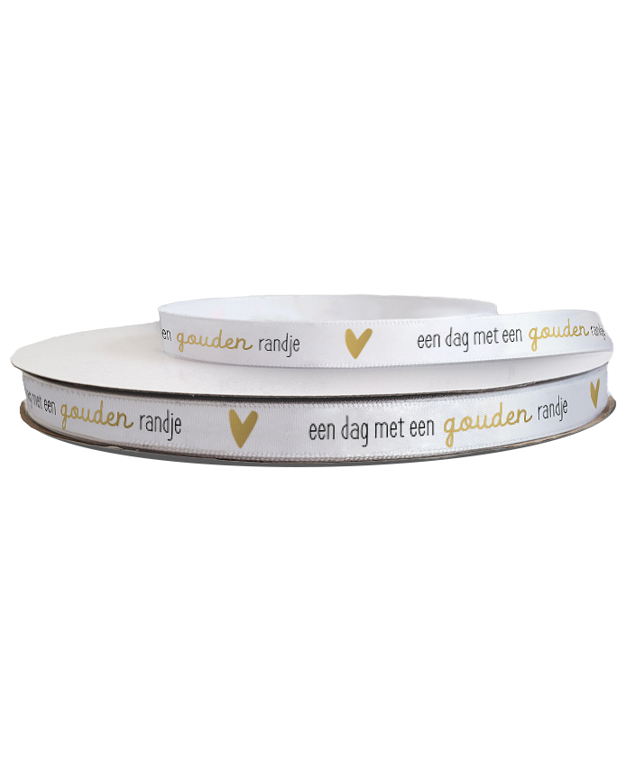 KP® Satijn lint 12mm - Een dag met een gouden randje wit/zwart+goud 100m