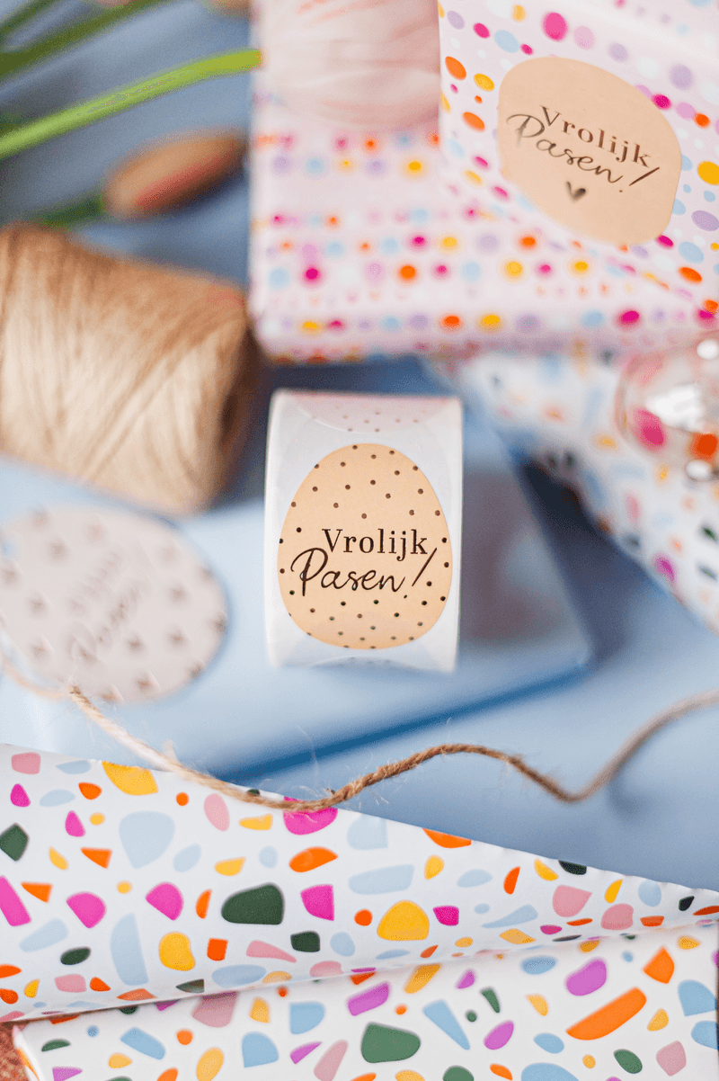 Deze lieve 'Vrolijk Pasen' stickers geven een cadeautje een extra persoonlijk tintje. Ideaal als sluitsticker of om kleine geschenken liefdevol te presenteren voor Pasen.