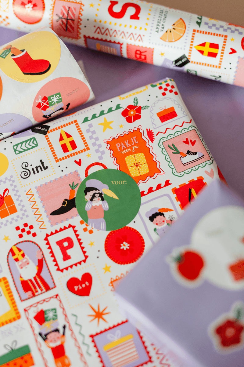 Rond wensetiket van 50mm met verschillende 'voor:' Sinterklaasstickers. Geschikt als feestelijke sluitsticker of cadeausticker. Ideaal voor op een cadeauverpakking of bij verzending van een bestelling tijdens de feestdagen.