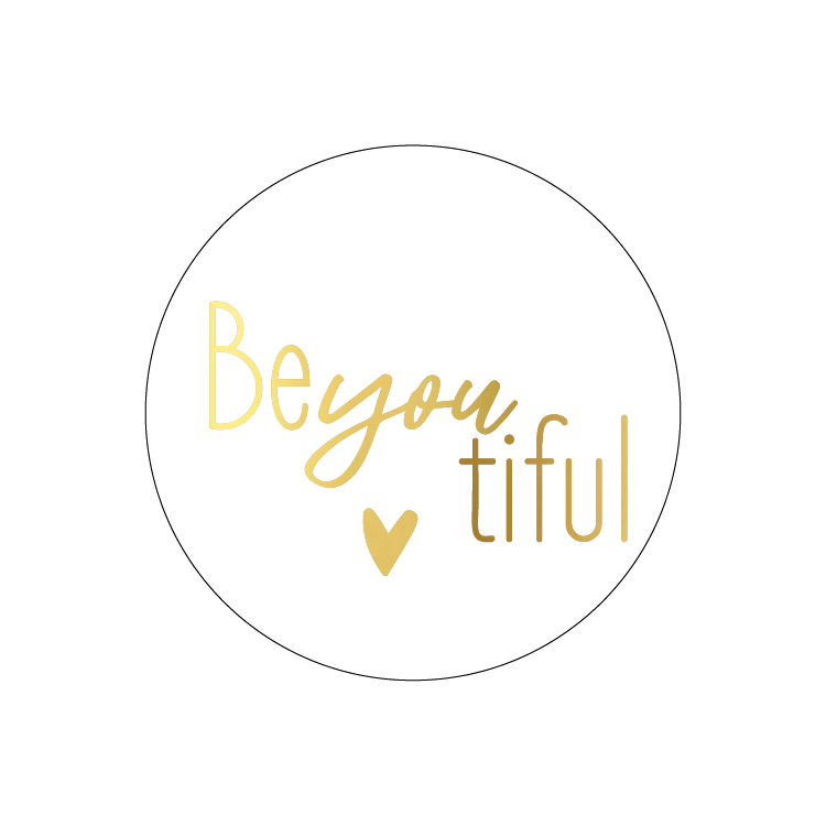 Stickers / Wensetiket / folie etiket rond met opdruk “Beyoutiful”. Te gebruiken bij verzending van de bestelling of bij uw geschenk.