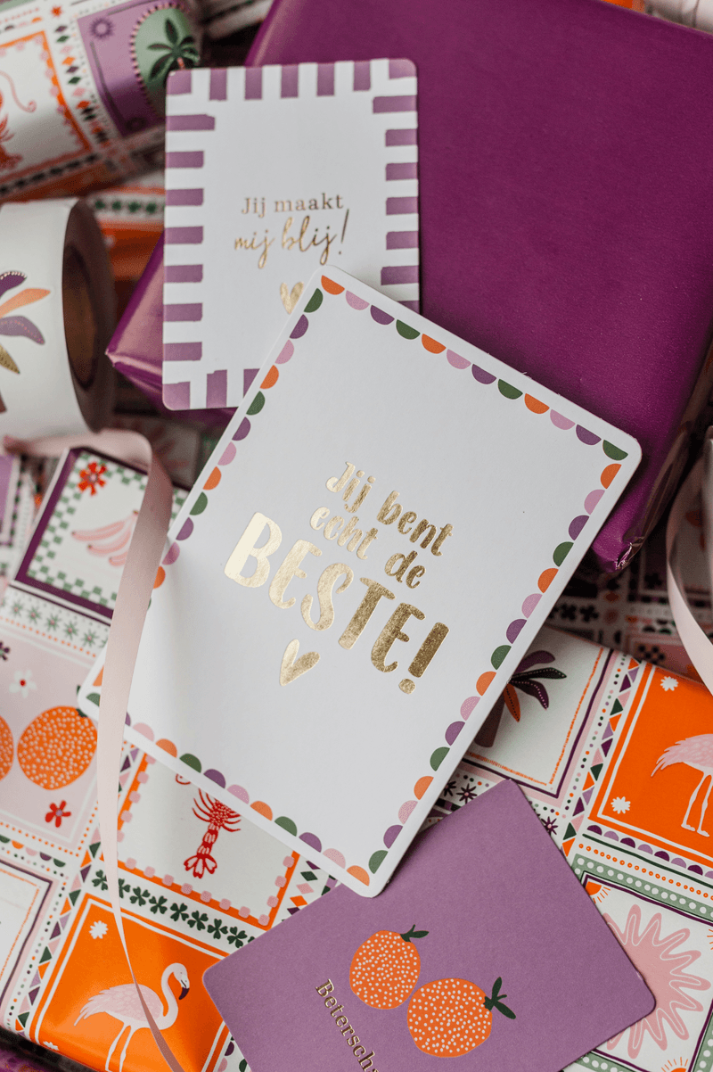 Perfect te combineren met een cadeau, een bos bloemen of een verzendpakket. Dankzij het handige A6-formaat met afgeronde hoeken passen deze kaarten bij elke gelegenheid. Op de achterkant is ruimte voor een persoonlijke boodschap, waardoor ze ook leuk zijn om gewoon zo te geven.